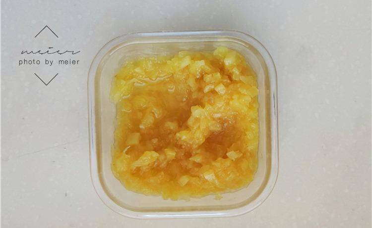 1、菠萝要提前处理一下,这个我前面的小哥有具体讲过,这里简单说一下,把菠萝切碎,放入锅中加约菠萝1/4左右的白糖,小火熬制不停用铲子翻炒,大约10分钟左右,水分会蒸发很多,加入少许水淀粉翻炒均匀,放入盒子里冰箱冷餐保存。