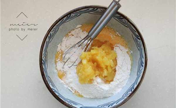 2、如果嫌加菠萝麻烦,也可以加芒果、香蕉啥的,不用事先炒制,直接切碎加面糊里就可以,清水可换成牛奶。