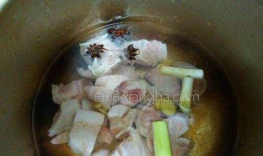 3.把猪蹄放进高压锅里,往锅里添水,水掩盖住猪蹄,然后放入料酒,白芷,桂皮,八角,葱姜。