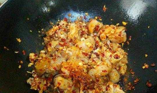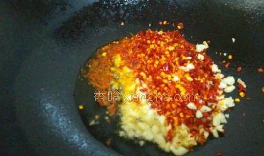 9.开大火,将锅烧热,锅热后放入油,油七八成热后倒入大蒜和辣椒面翻炒,炒出蒜香味。