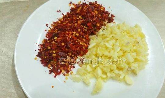 5.压猪蹄的同时,准备辣椒面,将大蒜切成末备用。