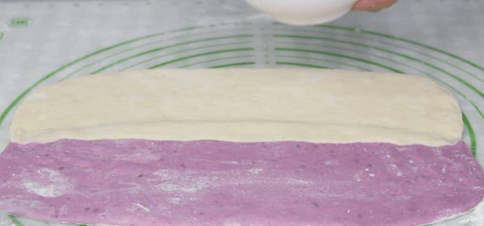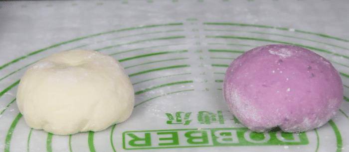 4、15分钟的时间过去了,我们的紫薯已经弄好了,将蒸好的紫薯放到一个干净一点大碗中,用铲子或者是擀面杖压成紫薯泥,压成紫薯泥之后先放到一旁晾凉备用。再准备一个干净点的大碗,向碗中加入150克面粉,1.5克酵母粉,一勺白糖,把已经晾凉的紫薯放到面粉中,用筷子将他们搅拌均匀,搅拌到没有干面粉的时候下手揉成光滑的面团,揉成光滑的面团之后盖上保鲜膜,饧面一个小时。