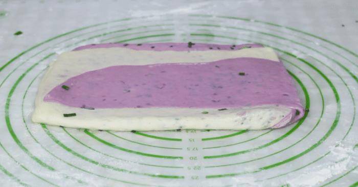 5、一个小时过去了,面也已经饧发好了,将两个面团拿出来,揉一揉排排里面的气,然后将两个面团搓成长条,用擀面杖擀成长方形面片,擀完后将两块面片衔接起来,接头处按紧,再刷上韭菜油酥,撒上适量的黑芝麻,开始折叠,折叠的方式没有规定,想要怎么折都可以可以按照自己喜欢的方式来折叠,但是一定要折出层次来。折的过程中也可以刷一点油,这样可以使分层更加松散。折叠完之后捏紧封口,在案板上撒一些面粉,然后用擀面杖将饼稍稍地擀薄,擀好后盖上保鲜膜二次饧发15分钟。