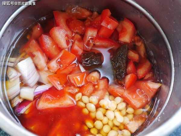 1、黄豆可以提前一天浸泡好,或者提前个三四个小时泡好也行。西红柿用刀在表皮划十字,放入开水中,烫1分钟,捞出,撕掉表皮,切成丁。