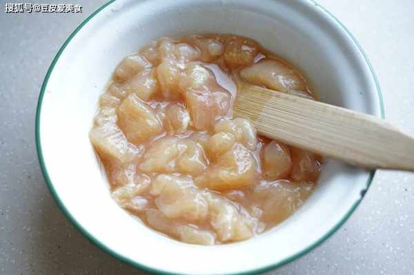 1、取1块鸡胸肉,清洗干净,切成丁,打入一颗蛋白,1大勺料酒,1勺淀粉,少许生抽,少许糖,适量盐,抓拌均匀,腌制15分钟。