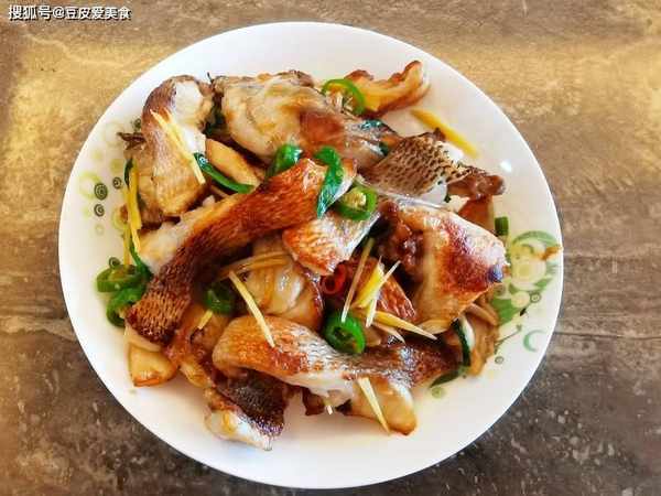 4、放入青红椒和姜丝,小心翻动一下,不要让鱼糊底了。煎至鱼肉熟透。下入葱段,再加少许油,倒入生粉水,转大火,再煎10秒。出锅,完成。