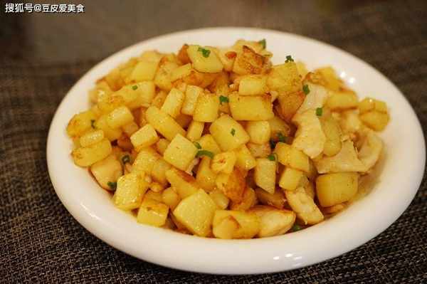 3、起锅倒油,油热后放入土豆丁,先不用去炒,铺平,煎一下。煎至底部有点金黄,可以闻到土豆的香味了,把土豆推到一边去,斜一下锅,让油流到空处,放入鸡丁。