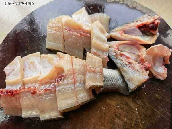 1、鲈鱼处理干净,鱼鳍和鱼尾都剪掉,用刀从鱼尾往上一点下刀,向鱼头方向片过去,把鱼片成两半,再把鱼头剁下来。鱼头剁成几场,鱼身切成等距的块。