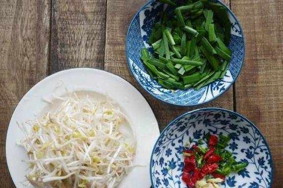 步骤:韭菜洗净切断,绿豆芽洗净备备用,备好干辣椒、葱、姜;