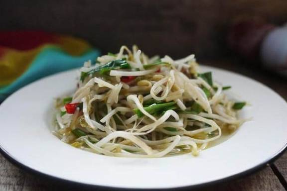 这道菜是非常清淡的一道美食,绿豆芽富含纤维素,是便秘患者的健康蔬菜,有预防消化道癌症(食道癌、胃癌、直肠癌)的功效。它有清除血管壁中胆固醇和脂肪的堆积、防止心血管病变的作用。中医认为经常食用绿豆芽可清热解毒,利尿除湿,解酒毒热毒。绿豆芽是祛痰火湿热的家常蔬菜,凡体质属痰火湿热者,血压偏高或血脂偏高,而且多嗜烟酒肥腻者,如果常吃绿豆芽,就可以起到清肠胃、解热毒、洁牙齿的作用。