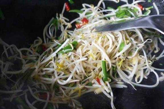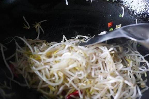 入绿豆芽进行翻炒;