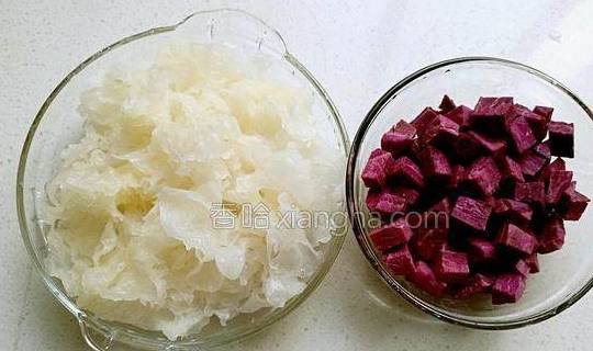 配料:泡发银耳1朵、紫薯1个、清水450毫升、冰糖适量烹饪步骤:1.准备食材。