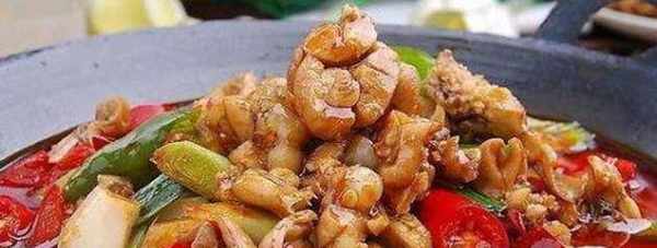3、腌好的牛蛙撒些淀粉,将其放入油锅炸至微黄捞出备用;锅中倒去多余的油,留少许底油,放入葱、姜、干辣椒、花椒和蒜头爆香;