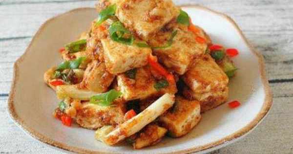 4.在锅中倒适量的油,在油温八成时放豆腐,炸一两分钟之后盛出装盘,等恢复有油温继续炸,豆腐的表皮发黄发硬即可出锅