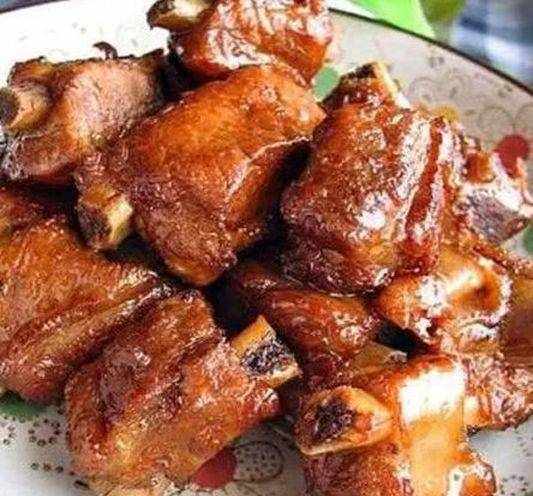 4、锅内留少许油,加入3汤匙白糖、少量肉汤,一点点盐(腌制时候已经加了盐,不要加多)加入排骨中小火煮5分钟。