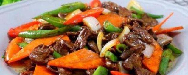 4、再放入青、红、紫椒切丝,调入生抽10克,炒均。最后倒入羊肉丝,翻炒均匀即可出锅