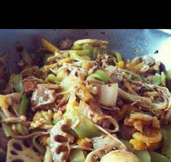 第7步、翻炒均匀后加入各种肉类、干豆皮。