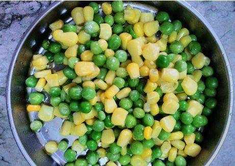 第五步,下入葱姜蒜末,继续炒香,放入提前焯过水的玉米粒和青豆,翻炒均匀后;
