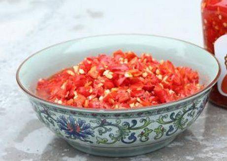 第四步,炒锅中添上少许的油,待油烧热后,先放入剁椒,略微翻炒片刻,炒出香味后;