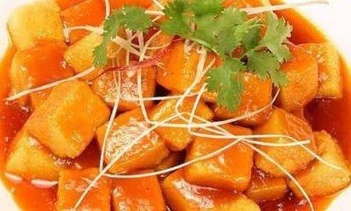 6.将煎好的豆腐块放入锅中翻炒,均匀裹上番茄酱即可。