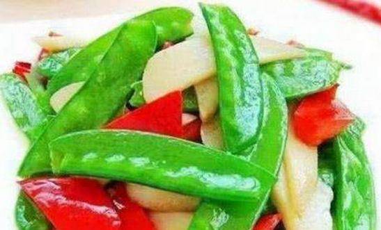 3、放入焯过水的。荷兰豆和红椒块,快速翻炒,加入盐、白糖、生抽翻炒均匀,最后加鸡精即可。