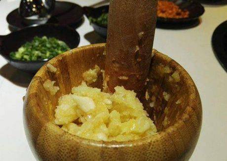 第三步,大蒜取需要的量,剥去皮后,放在捣蒜杵中,加上些许的食盐,捣成蒜泥;