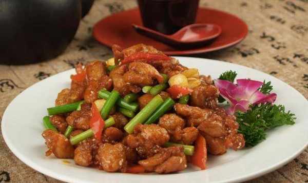 锅中留油,油热后倒入麻椒和花椒翻炒出香味,倒入干辣椒段和炸好的鸡块翻炒均匀。加入蒜片和香葱段,再倒入青红椒段翻炒均匀。倒入调好的了之大火烧至汤汁收干。关火,出锅装盘即可食用。