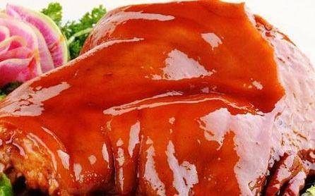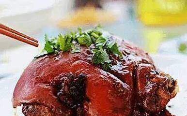 肘子凉水下锅煮,加料酒葱姜,打出浮沫,煮至七时尚捞出,用净毛巾或厨房用纸布搌干水,趁热用红酱油涂抹肉皮备用;