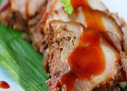 将蒸盆上笼用旺火蒸3小时左右,微火1小时蒸,以烂为度,取出、揭去纱布,扣入盘中,拣去八角、桂皮; 放入盘中浇上勾芡汁