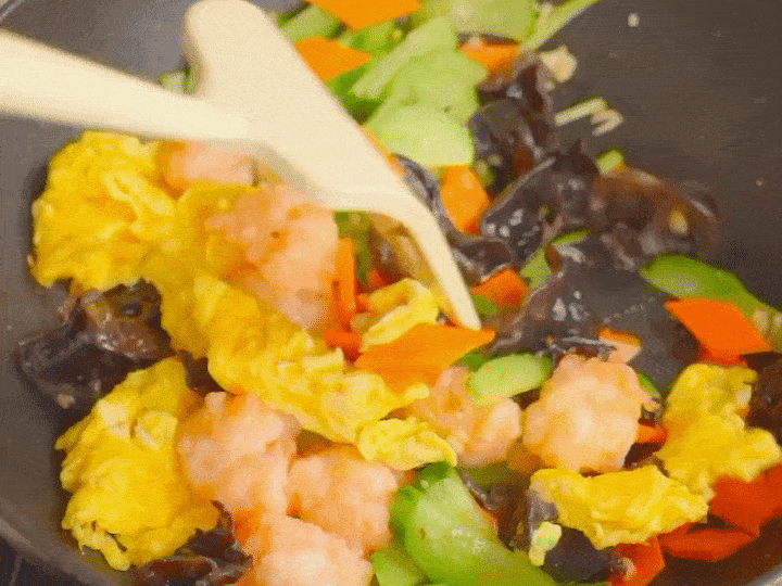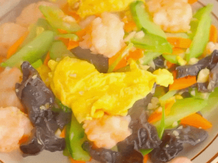 鸡蛋滑嫩、虾肉Q弹,炒熟的黄瓜多了一份清甜,加上脆脆的木耳,真是食欲满满!