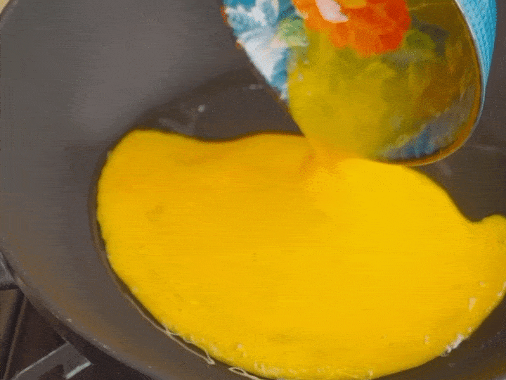 锅中倒油,油热后倒入蛋液,成型后滑散,炒熟后盛出。