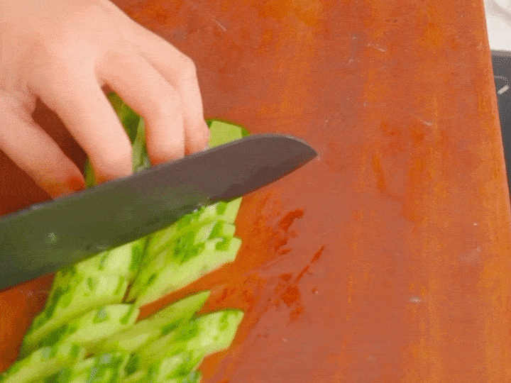 黄瓜去皮,可以留一点绿色皮炒出来更好看,接着斜刀切成小块。