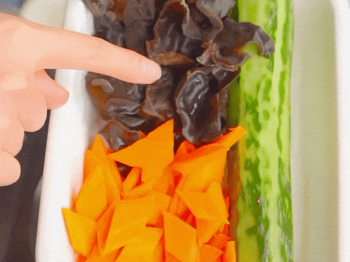 烧开一锅水,加入1小勺盐和1瓷勺油。接着放入黄瓜块、黑木耳、胡萝卜片,焯水30秒后捞出。