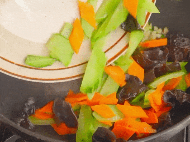 胡萝卜切成斜片,木耳泡发备用。