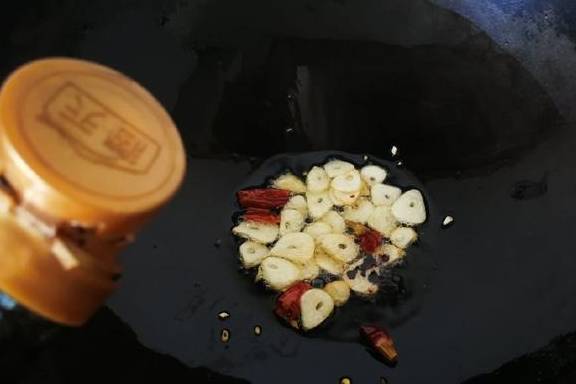4、锅中放入适量的花生油,先放大蒜片小火煸炒至微微发黄,再放干红辣椒炒出香味,放少许老抽激发出酱香味。