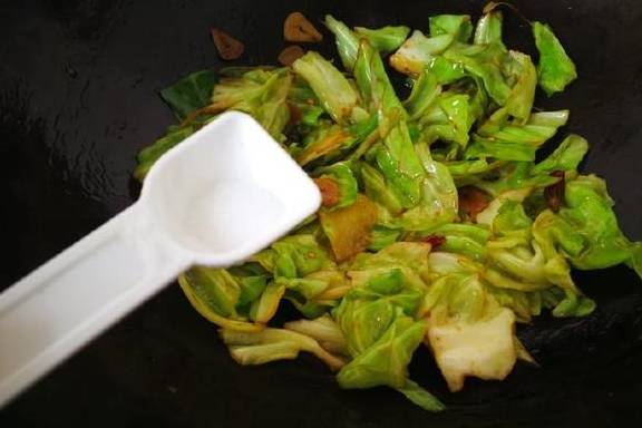 6、根据自己的口味调入少许盐,少许生抽,快速炒均匀后出锅。卷心菜在锅中停留的时间不要太长,以免破坏其营养素。