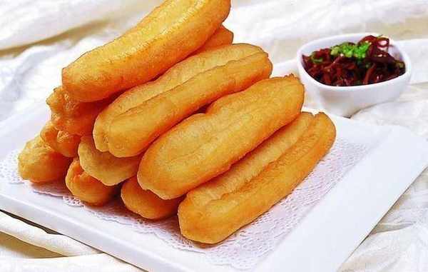 锅中烧油,油热后把做好的油条坯抻长,放入油锅中炸至表面金黄,捞出控油,即可食用。