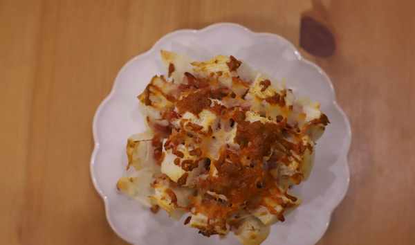 【培根芝士烤饅頭】饅頭的口感平淡無奇,換個吃法說不定你會喜歡,饅頭切十字花刀,可以切深一點兒,但不要切斷,培根切碎,塞進饅頭縫裏,表面撒上芝士,烤箱200度上下火烤10分鐘。< /p>