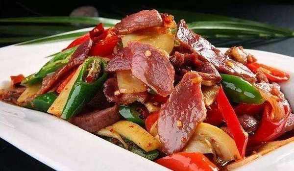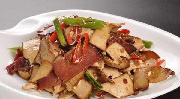 锅中烧油,油热后倒入腊肉片翻炒出油脂,腊肉呈时尚色。放入辣椒、葱和生姜翻炒均匀。倒入香干、十三香、红油豆瓣翻炒1分钟。关火,出锅装盘即可。