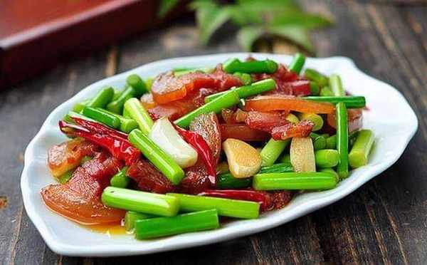 做法:把腊肉清洗干净,放入蒸锅中。大火蒸20分钟。取出,稍微凉一下。切成薄片。蒜薹洗净去头切成段,干辣椒洗净切斜片备用。