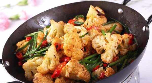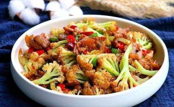 锅中烧水,水开后放入花菜大火焯水1分钟,捞出控水备用。锅中烧油,油热后倒入猪肉翻炒至变色,倒入葱姜蒜、杭椒和朝天椒翻炒出香味。
