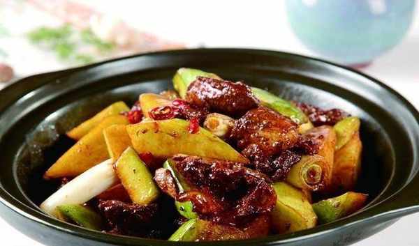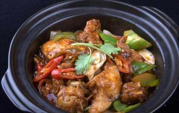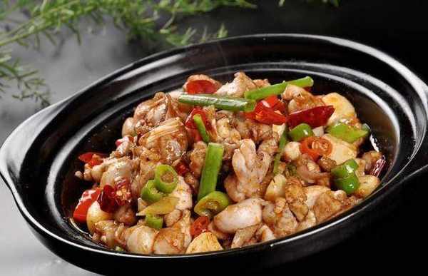 砂锅中铺上一层青椒片,把焖煮好的牛蛙倒在砂锅上,继续炖煮1分钟。关火,即可食用。