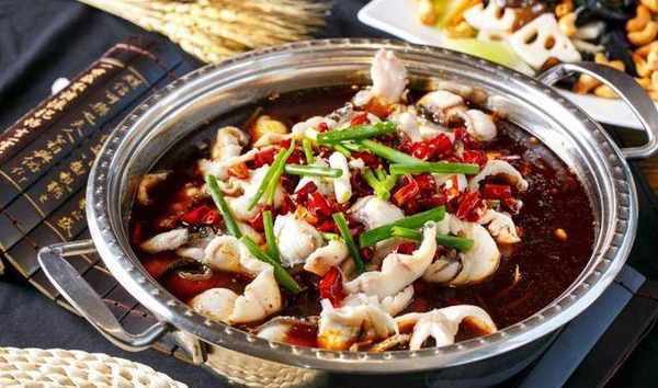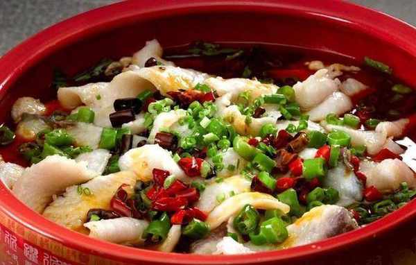 锅中下入腌制好的鱼片大火煮开,捞出鱼片铺在配菜上。加入另一半的干辣椒花椒,锅中烧油,油热后倒在辣椒和花椒上即可食用。