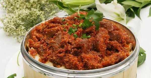锅中烧水,水开后放入牛肉中火蒸40分钟,取出扣在盘中,加入青蒜末即可食用。