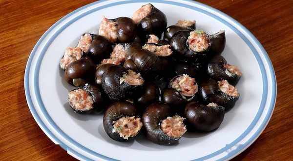 5、 将拌好的馅儿重新塞回螺蛳壳里面;