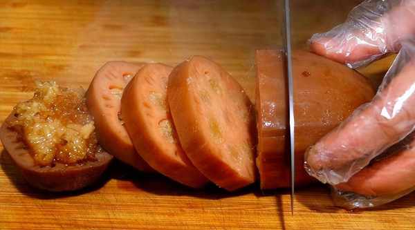 4、 将搅拌好的糯米用筷子塞进莲藕里面,用筷子戳一戳压压实;