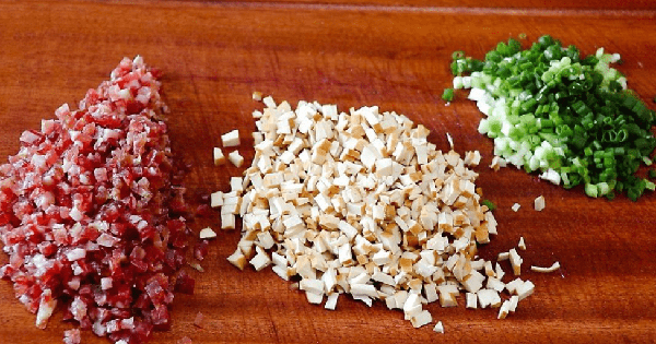 1、 笋子、香干、香肠都清洗干净,切成碎末;小葱清洗干净切成葱末;