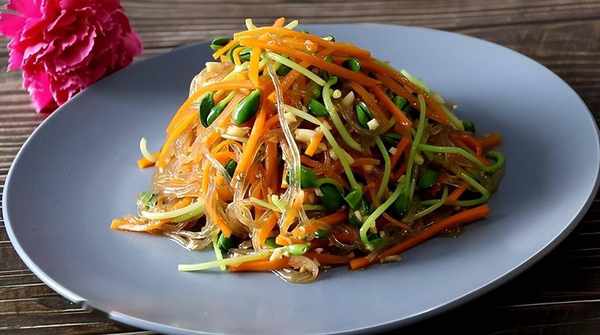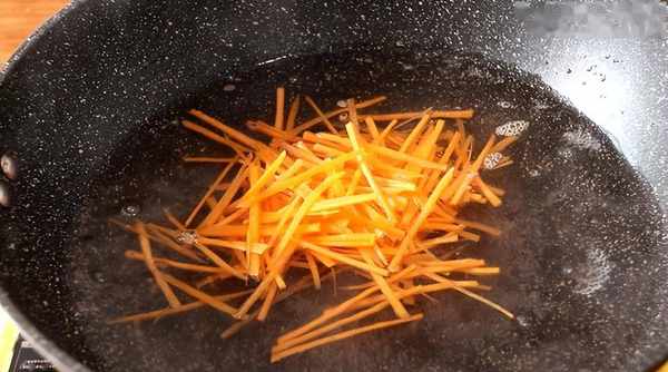 1、 胡萝卜清洗一下,去皮先切成片再切成细丝;粉丝提前泡软,再切成段;