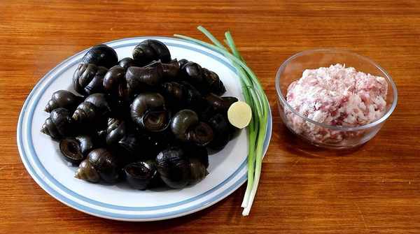 准备食材:田螺、猪肉泥、小葱、生姜、辣椒、大蒜、青椒、鸡蛋、生抽、蚝油、