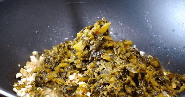 3、 接着再将腌菜也放入进去,腌菜有咸味,可以少放一点盐;